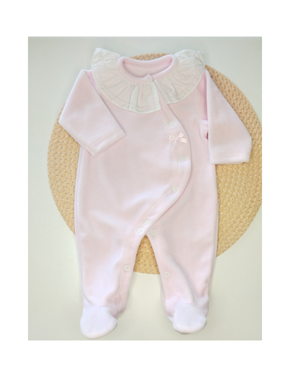Babygrow em veludo com gola de folho. Fecha com molas de pressão.