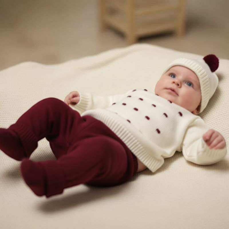 Conjunto de Calça s/ pé + Gorro + Camisola. Fecha com botões atrás.