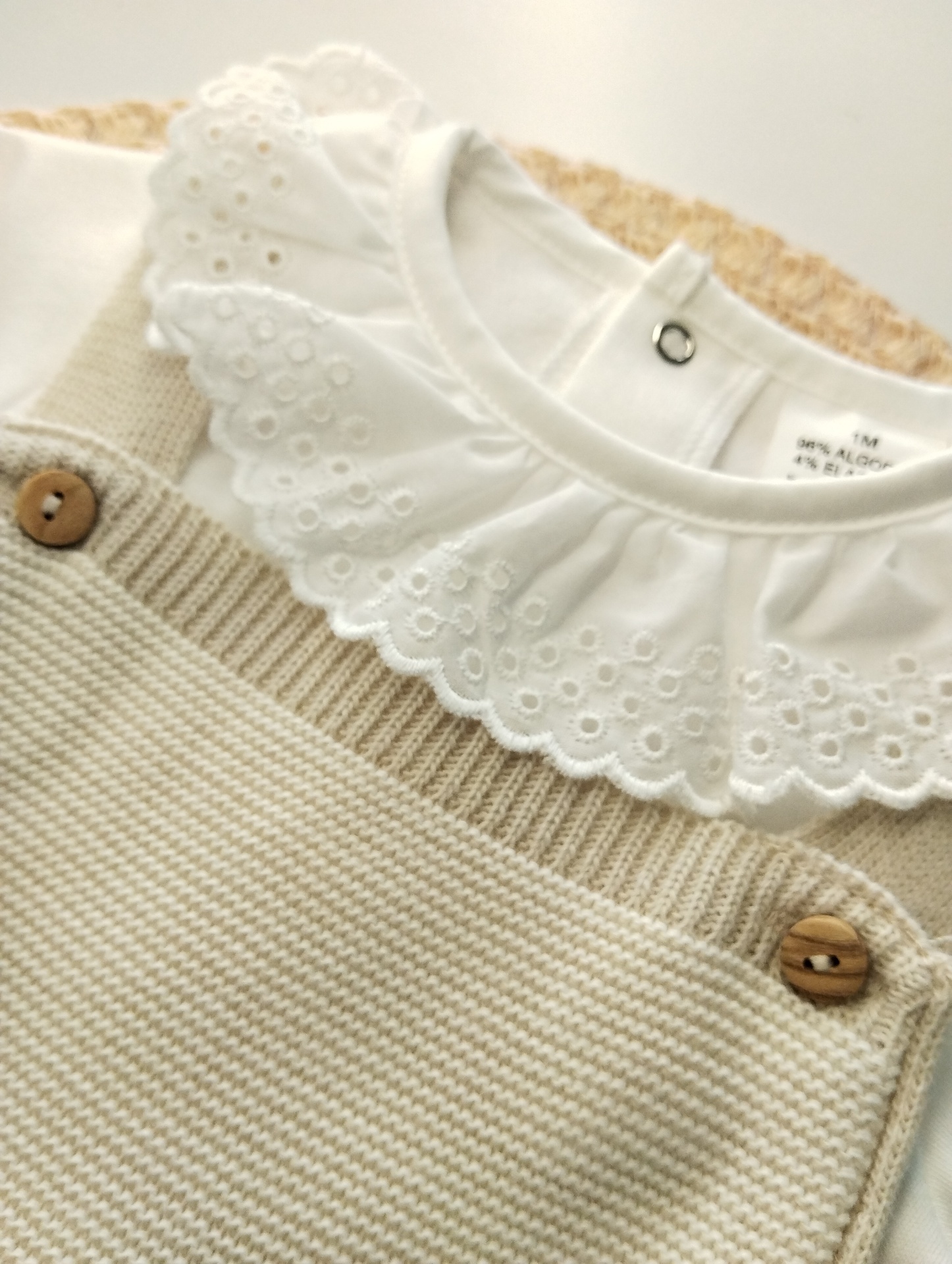 Conjunto Jardineira + Body Gola Bordado Inglês - Areia