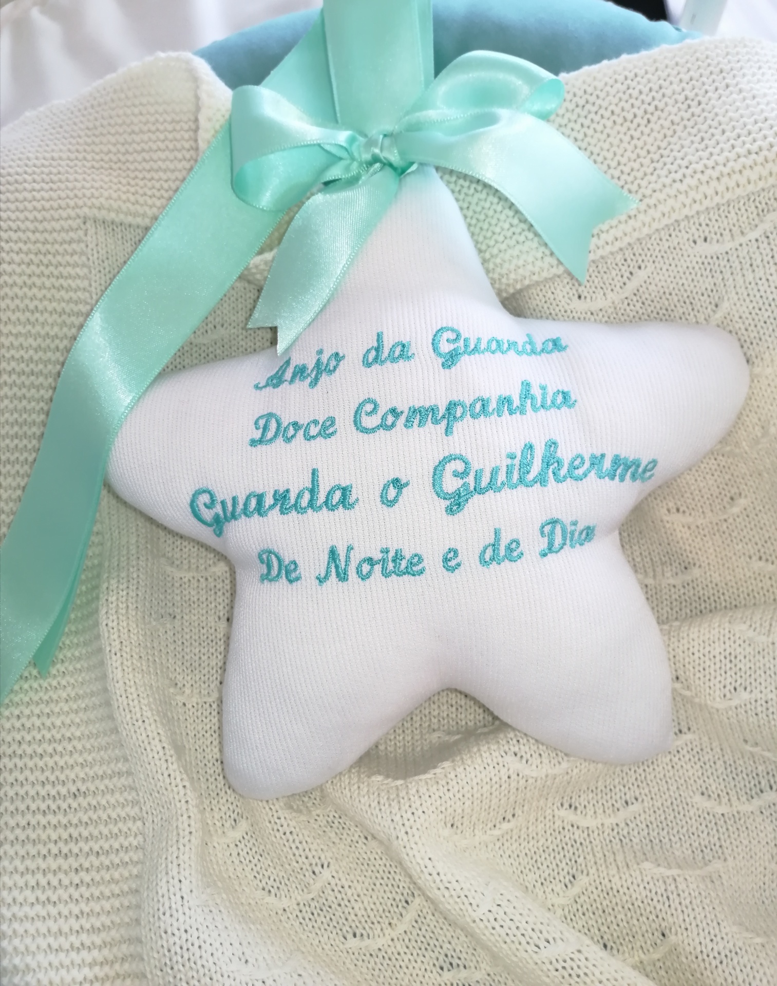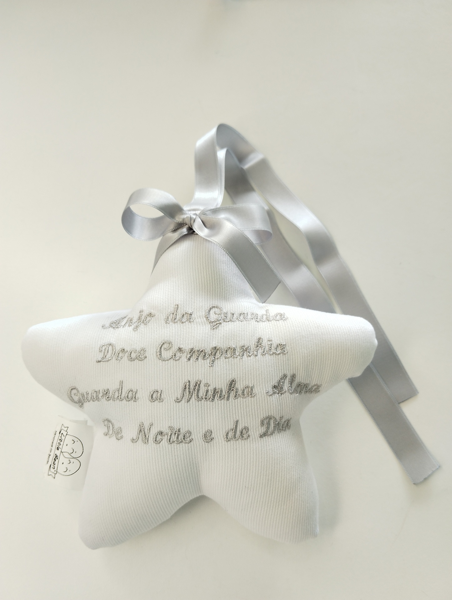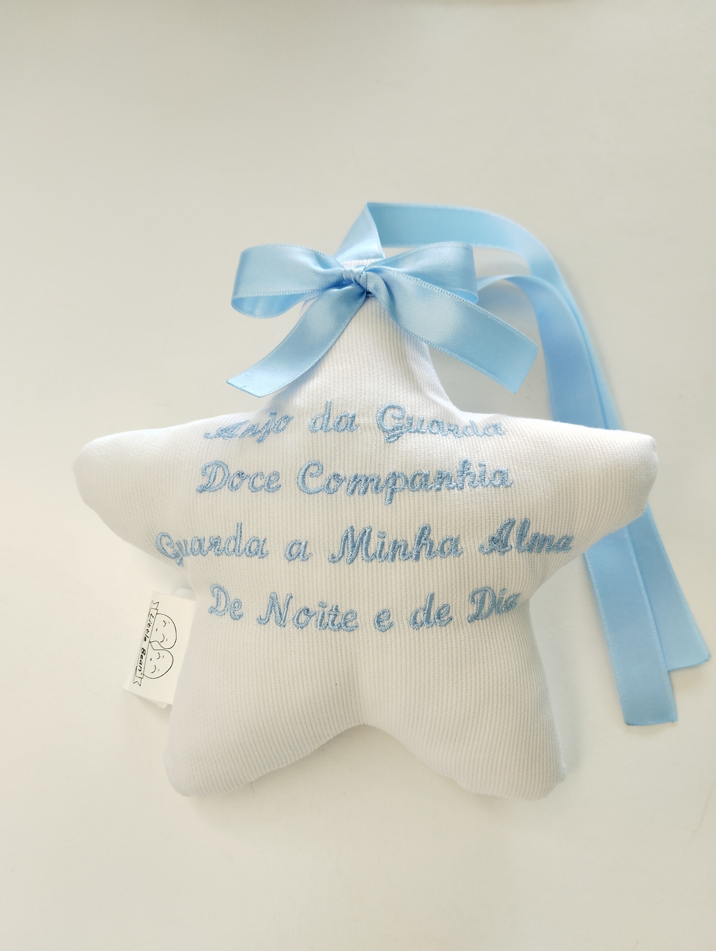 Estrela decorativa, personalizada com a oração do Anjo da Guarda. Pode pendurar na cama, na porta, na cómoda, etc.